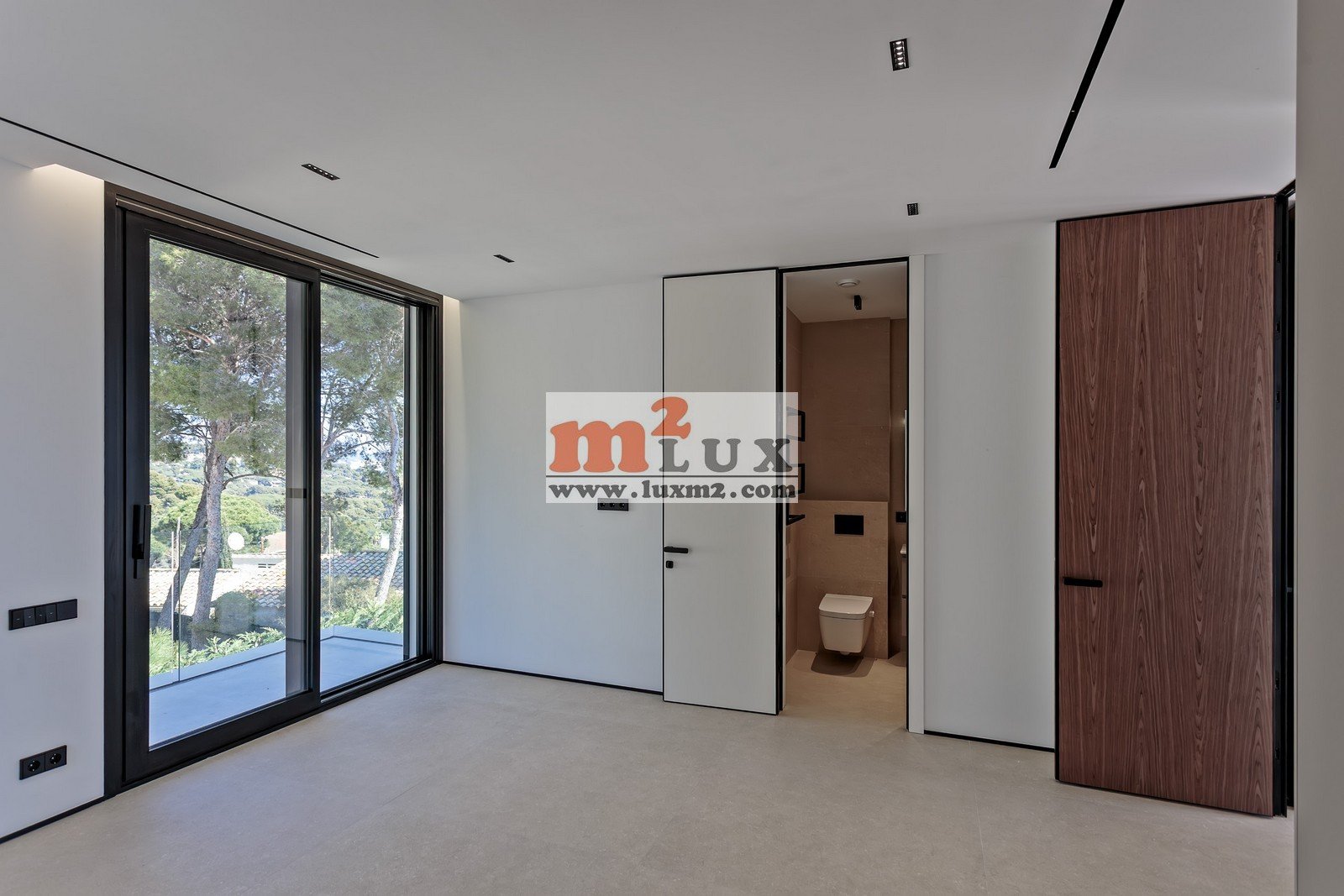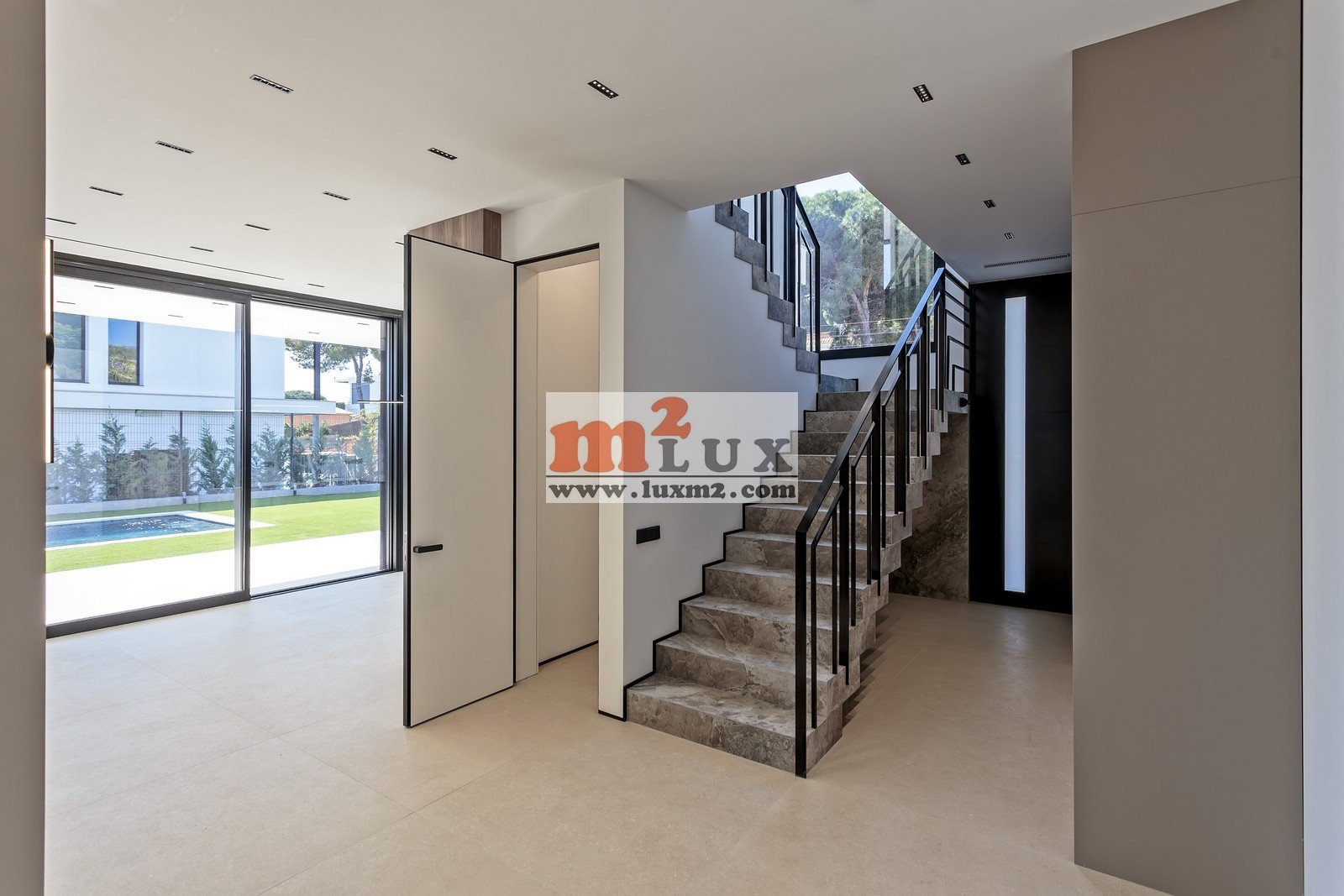 This level features a spacious, sun-drenched living room that flows seamlessly into a modern kitchen. Sliding glass doors lead to a covered terrace and a large private pool (3.5 x 10 m) — its elongated shape and azure water perfectly complement the home’s architecture, inviting you to relax during a warm afternoon.